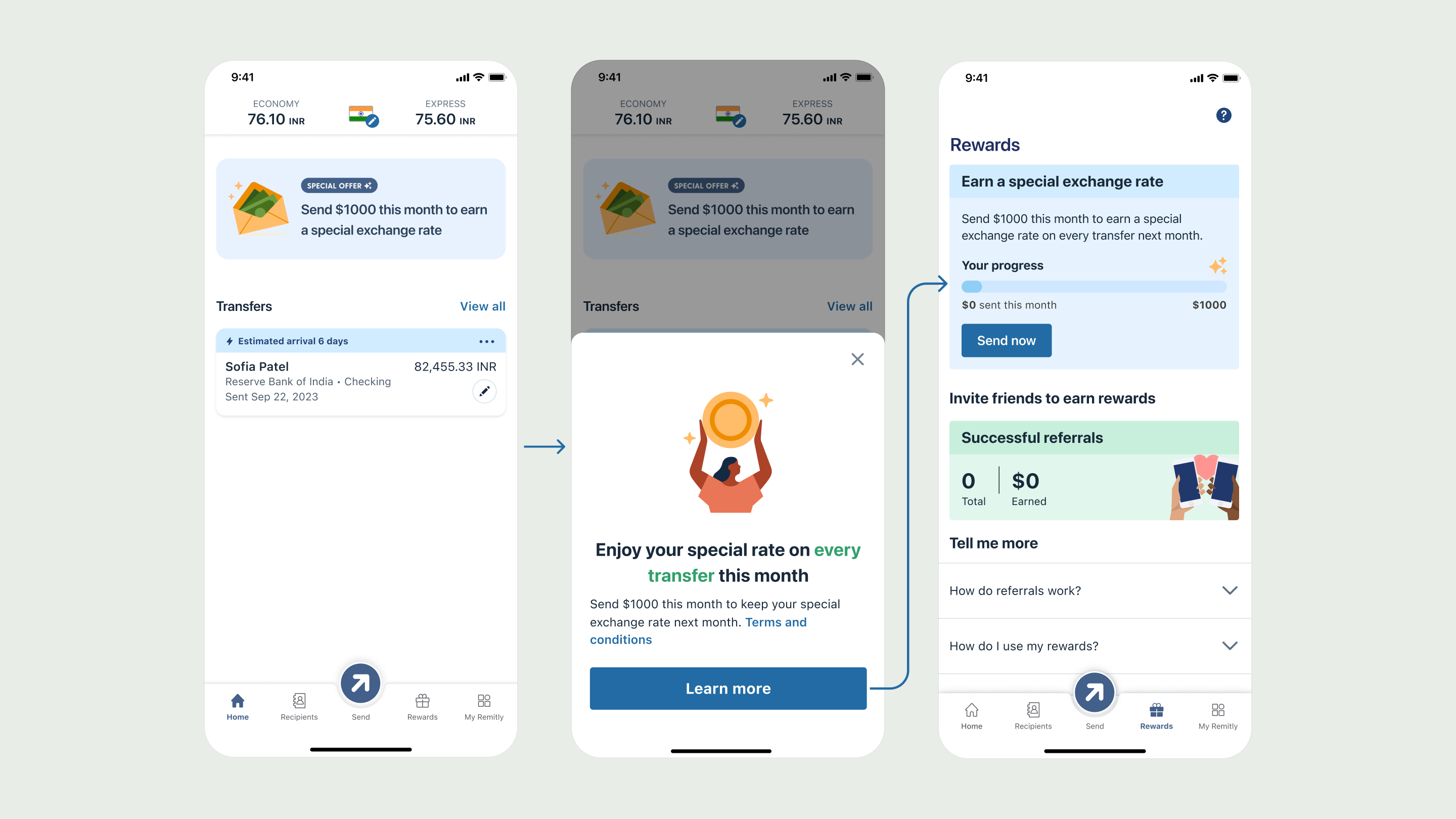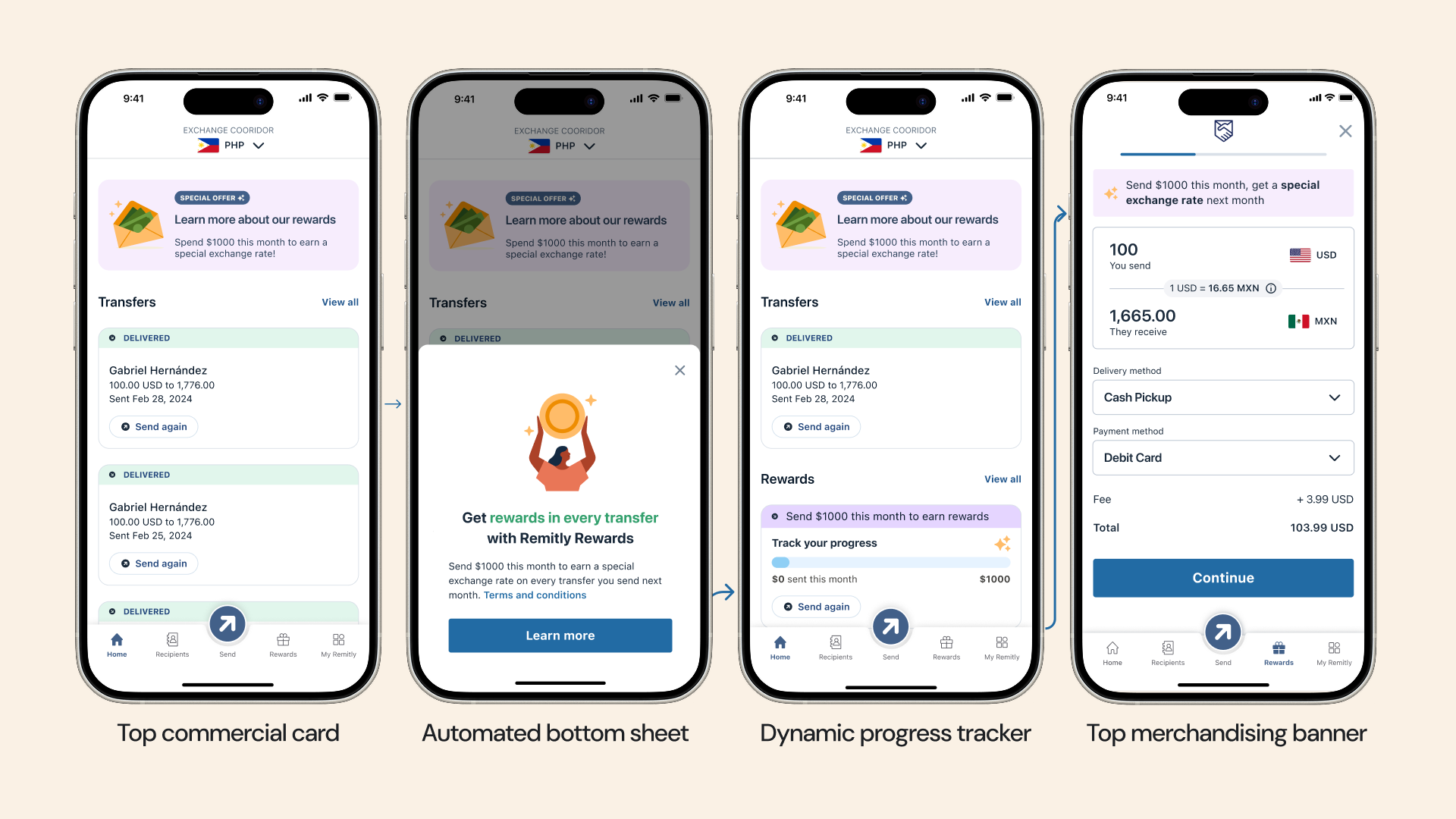 The progress card helps users track how much they've sent with Remitly, clearly showing how close they are to earning rewards and celebrating their success along the way.